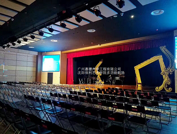 通常演藝廳主舞臺(tái)的高度會(huì)比觀眾廳高,因此容積比較大,混響時(shí)間過(guò)長(zhǎng),會(huì)對(duì)觀眾廳產(chǎn)生耦合效應(yīng),影響到觀眾廳的音質(zhì),側(cè)臺(tái)之間距離過(guò)長(zhǎng),會(huì)產(chǎn)生回聲,影響舞臺(tái)的聲環(huán)境。主舞臺(tái)、側(cè)臺(tái)和后臺(tái)均需進(jìn)行吸聲處理,使舞臺(tái)混響時(shí)間接近觀眾廳混響時(shí)間。同時(shí)還有舞美設(shè)計(jì)等,此類物品的吸聲量均應(yīng)予以綜合考慮都會(huì)影響到舞臺(tái)的混響時(shí)間。